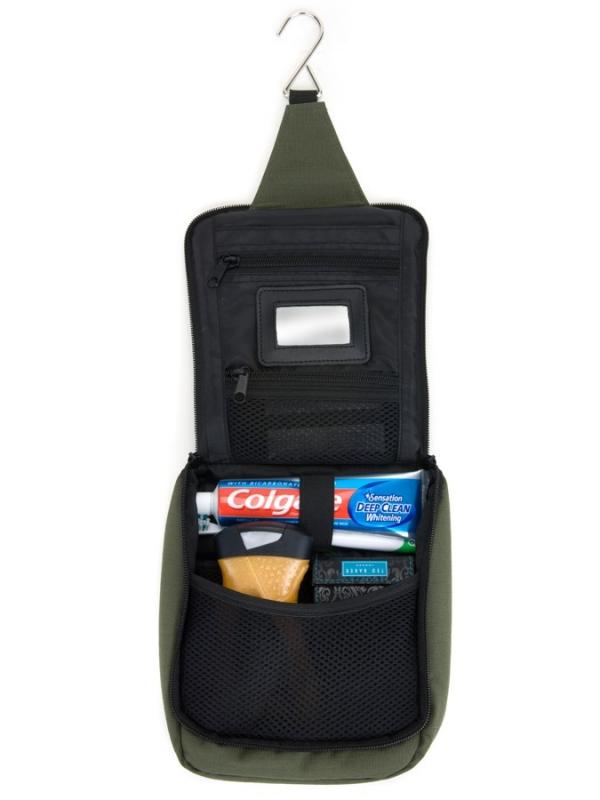 Compacte toilettas voor alle noodzakelijke toiletgerei als tandpasta, tandenborstel, deodorant, douchegel, shampoo e.d. Verkrijgbaar in de kleuren Olive, Black Afmetingen: 23,5x22x7cm. Weegt 180G